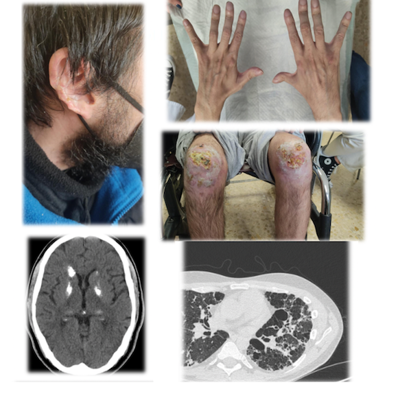 En resumen, se presenta un varón de 17 años con clínica de poliartritis erosiva FR positivo (título bajo), ANA+ y Anti-DNA+, linfopenia intermitente y una sola determinación ACA IgM positiva, lesiones cutáneas tipo perniosis/sabañón (chilblain lupus-like) y afectación pulmonar intersticial patrón tipo NIU junto con historia desde la infancia de infecciones recurrentes respiratorias, retraso de crecimiento ponderal y estado inflamatorio persistente. Iniciando tratamiento con hidroxicloroquina, prednisona a dosis medias y azatioprina, con empeoramiento articular, pulmonar y cutáneo en revisiones sucesivas. Años más tarde, se objetiva la aparición de extensas lesiones necróticas en ambas rodillas, con biopsia cutánea inespecífica e IFD negativa, sin datos de trombosis, infiltrados linfocíticos o datos de vasculitis.